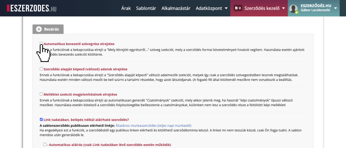 By expanding the Advanced Settings section, you can choose from the following options: Hide automatic introduction section Hides the formal introduction (“Made between the parties…”). When used, it’s recommended to manually write your own introduction.