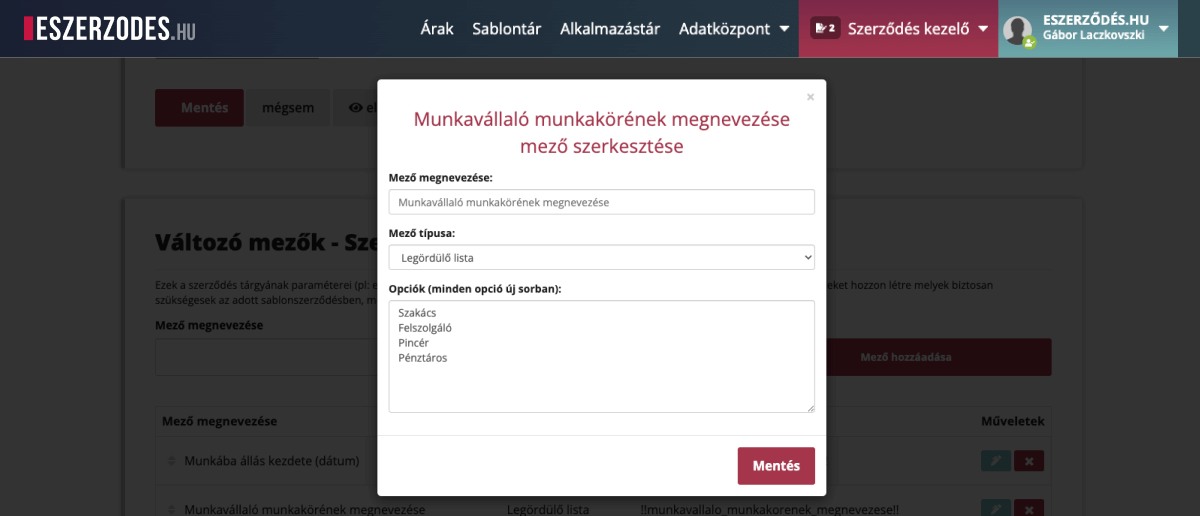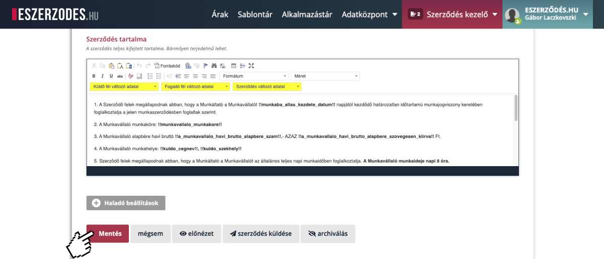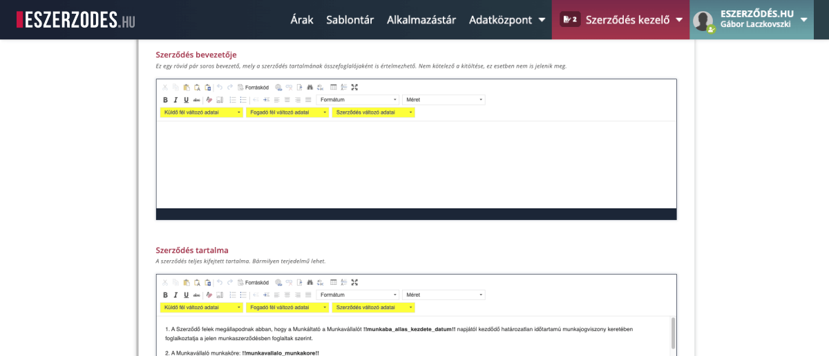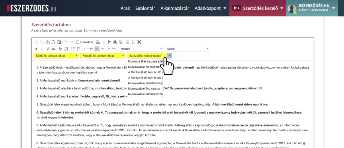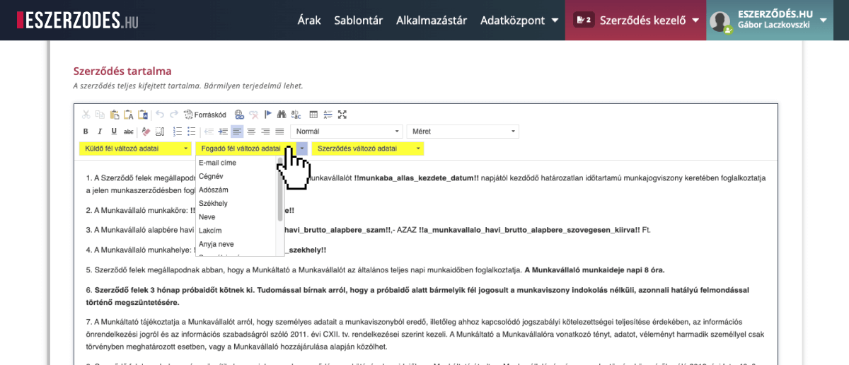 You can freely insert variable field codes into your text; the system will automatically replace them with the entered values during contract generation. Use the yellow dropdown menu to select the desired field and insert it at the cursor position with a single click. This saves time and avoids manual entry errors.